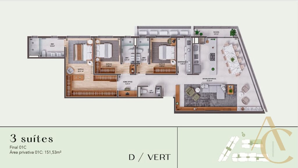 Apartamentos com 3 suítes, home office e despensa
