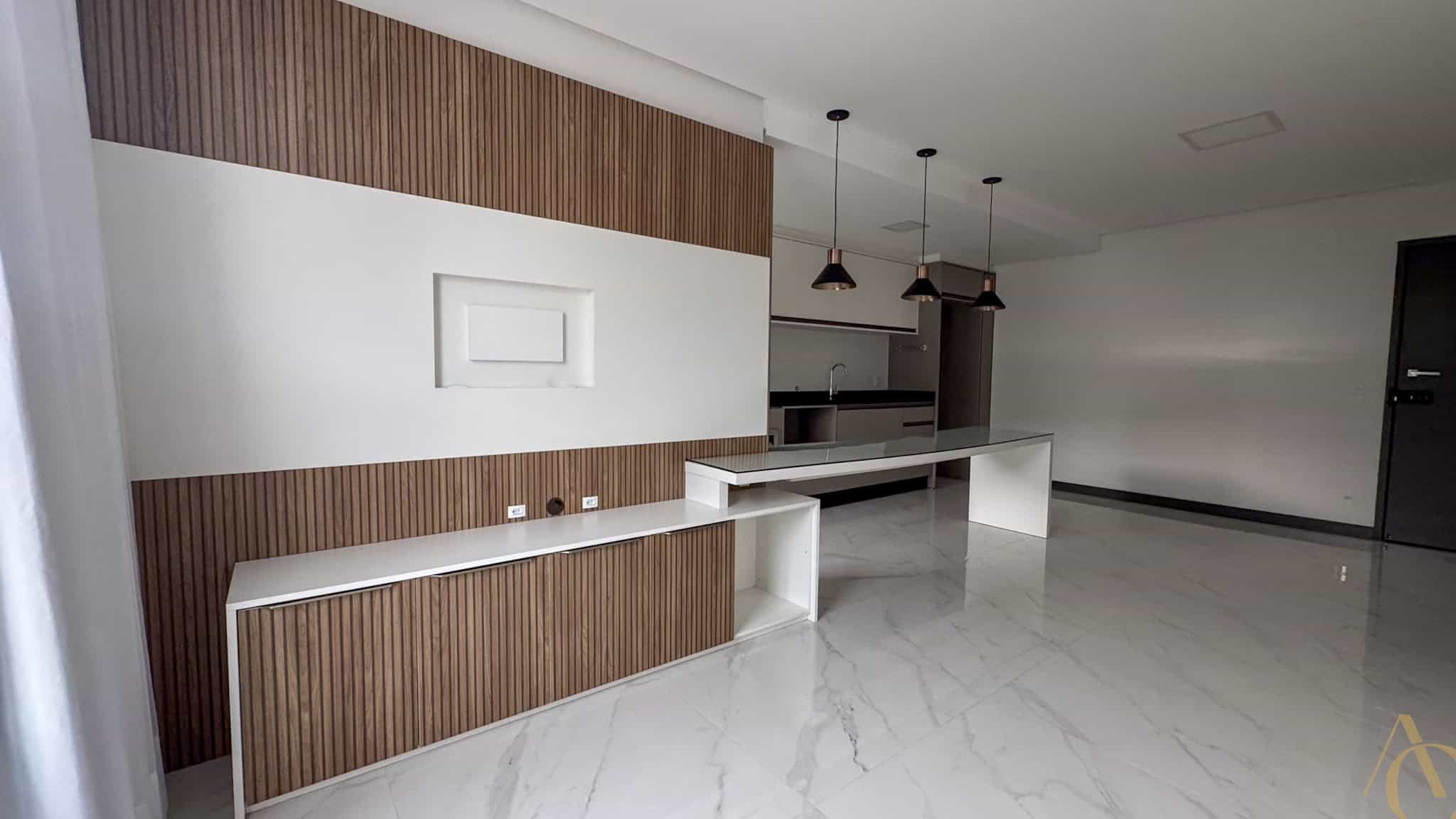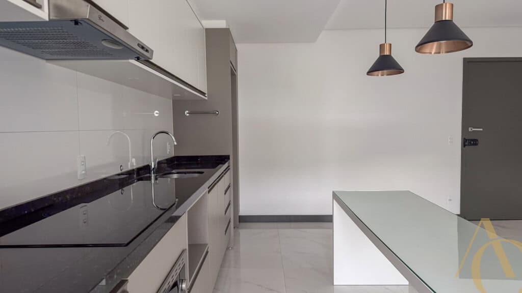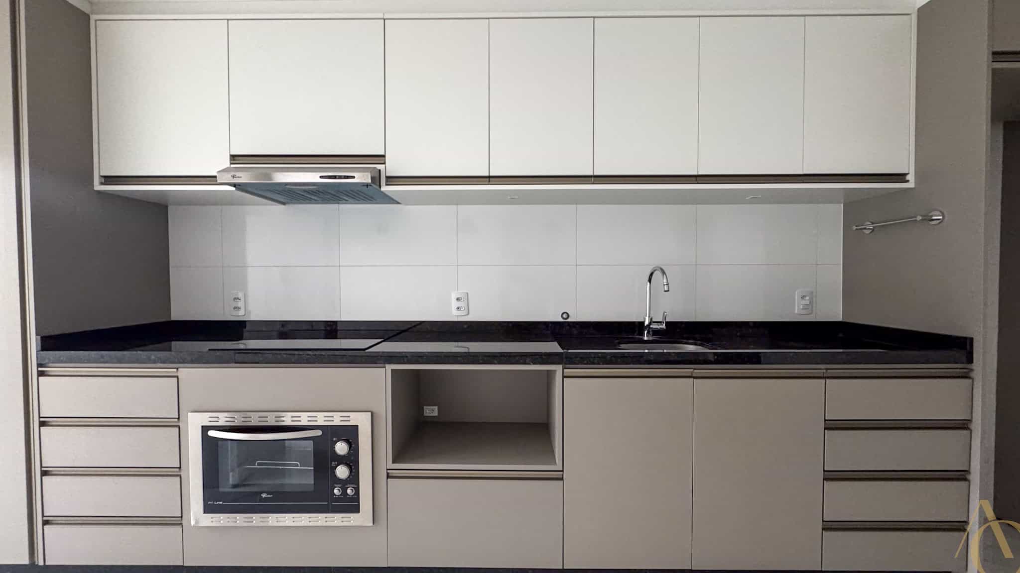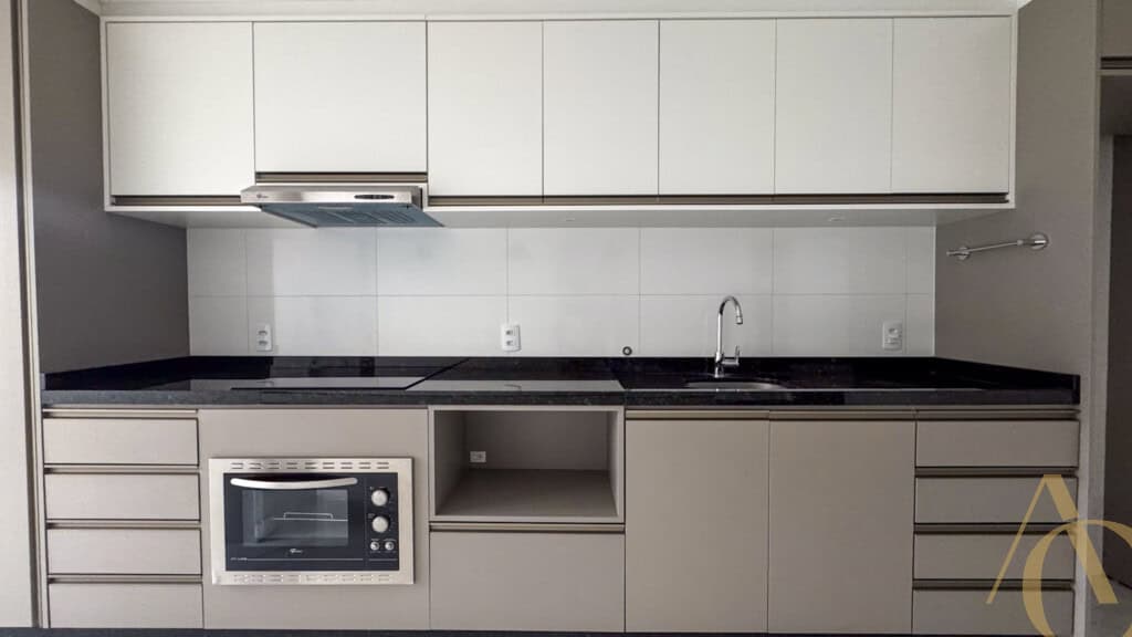 A área social é composta por uma sala ampla, adequada para dois ambientes, integrada à cozinha, favorecendo a convivência e o aproveitamento do espaço. A cozinha é equipada com armários planejados, oferecendo excelente capacidade de armazenamento e acabamento de alto padrão. O apartamento é semimobiliado, permanecendo itens fixos que agregam praticidade ao dia a dia.