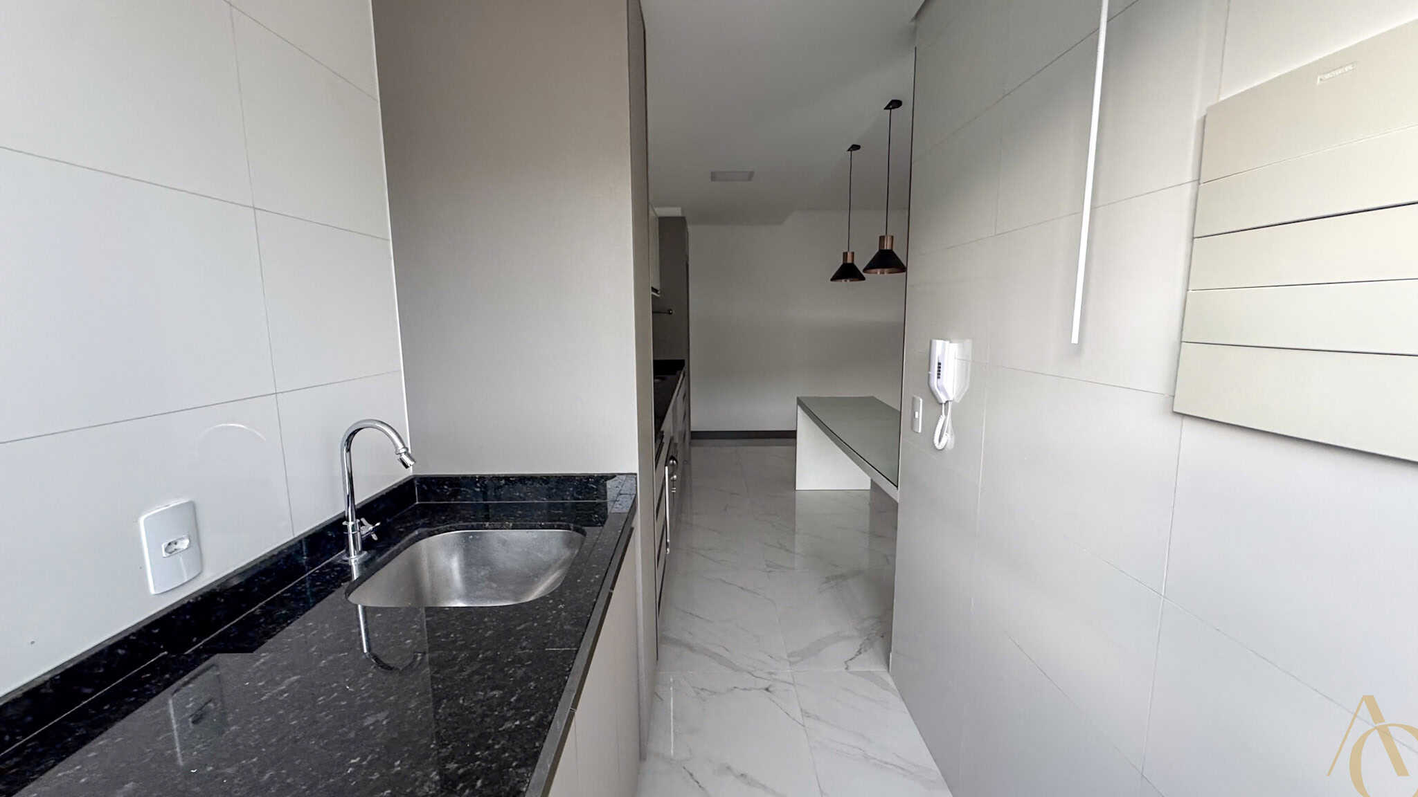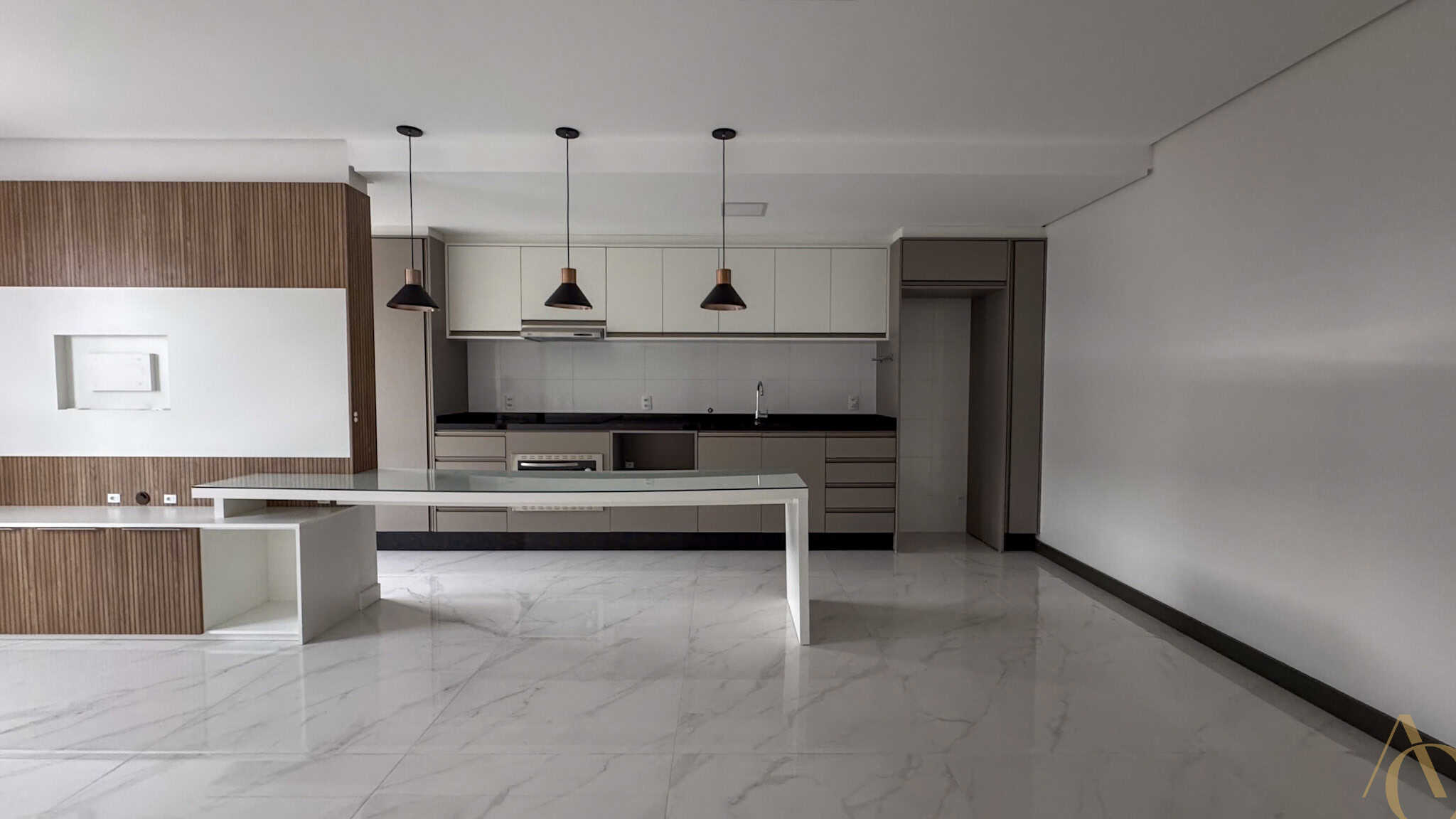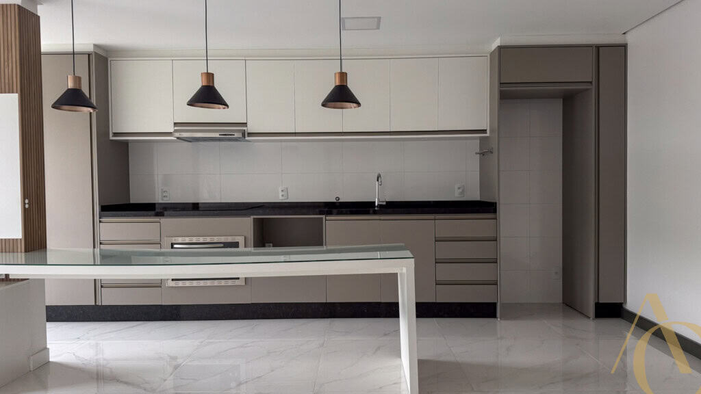 A área social é composta por uma sala ampla, adequada para dois ambientes, integrada à cozinha, favorecendo a convivência e o aproveitamento do espaço. A cozinha é equipada com armários planejados, oferecendo excelente capacidade de armazenamento e acabamento de alto padrão. O apartamento é semimobiliado, permanecendo itens fixos que agregam praticidade ao dia a dia.