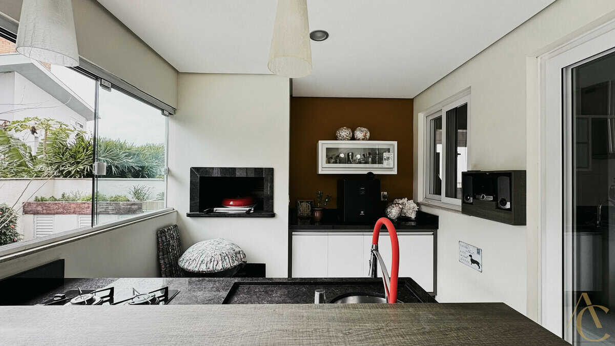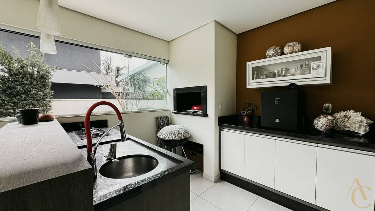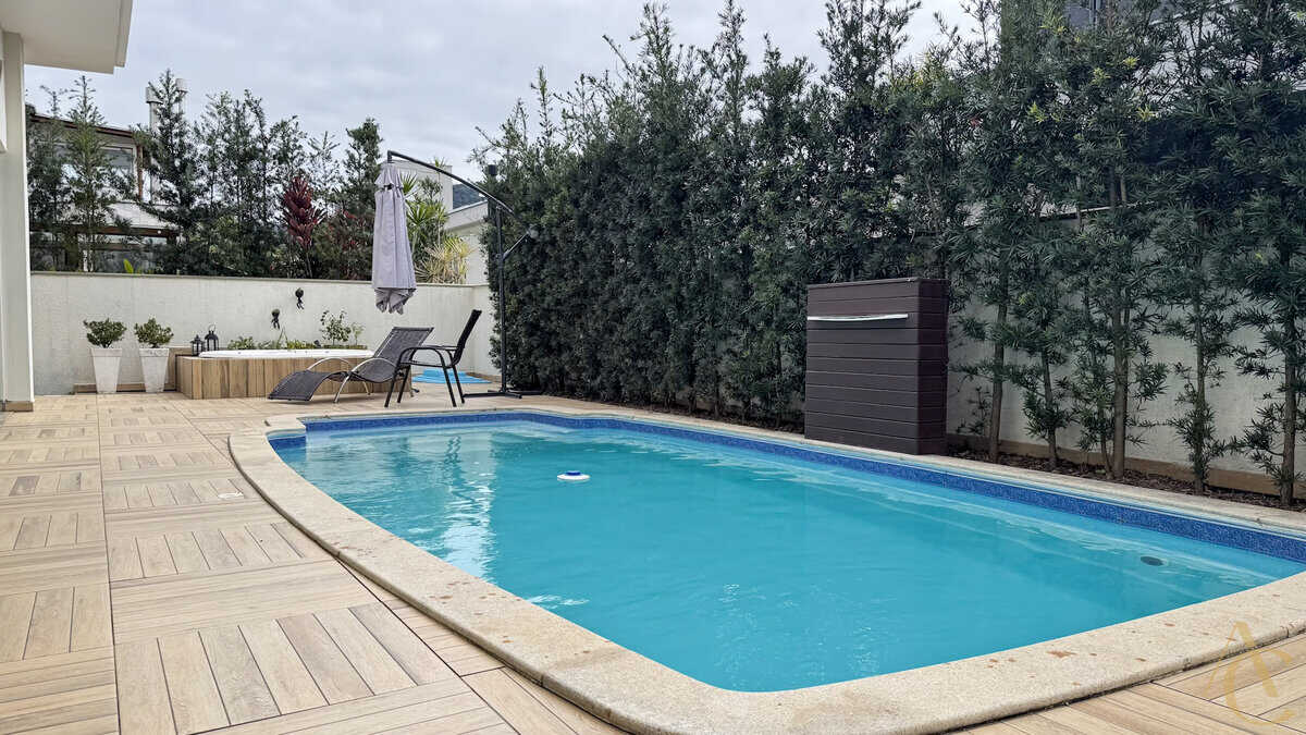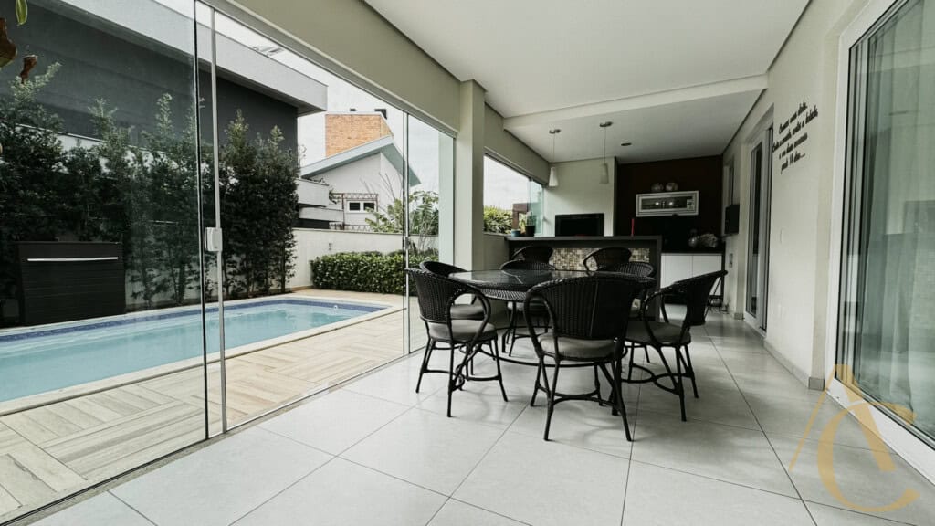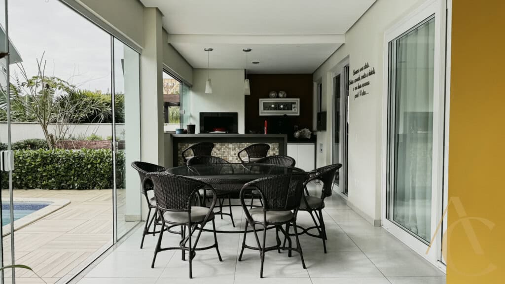 - Varanda gourmet com churrasqueira integrada à piscina e spa