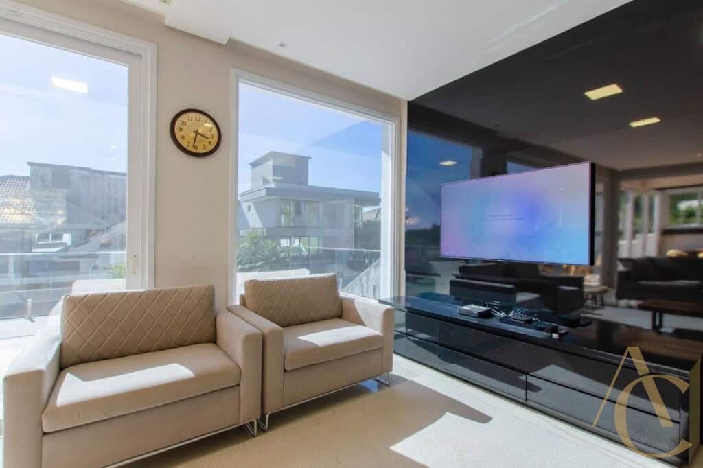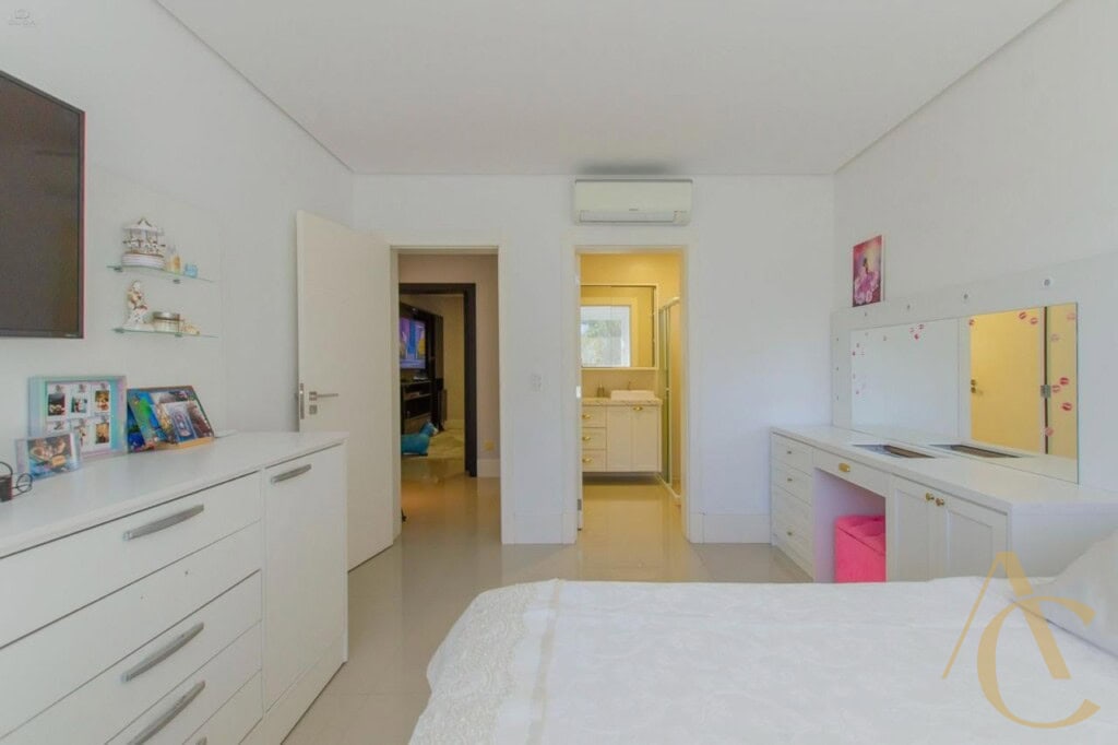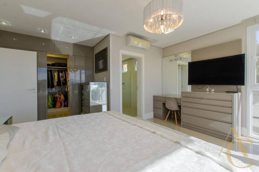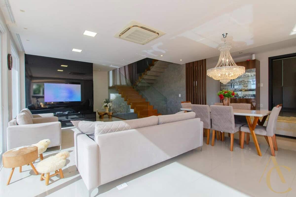 A casa conta com quatro suítes amplas, todas com excelente iluminação natural e climatização completa em ar-condicionado, garantindo conforto térmico em todas as estações. O living integrado, com acabamento em gesso e projeto luminotécnico, cria uma atmosfera sofisticada e acolhedora, perfeita para receber amigos e familiares. A cozinha planejada alia funcionalidade e elegância, totalmente equipada para atender às mais altas exigências do dia a dia.