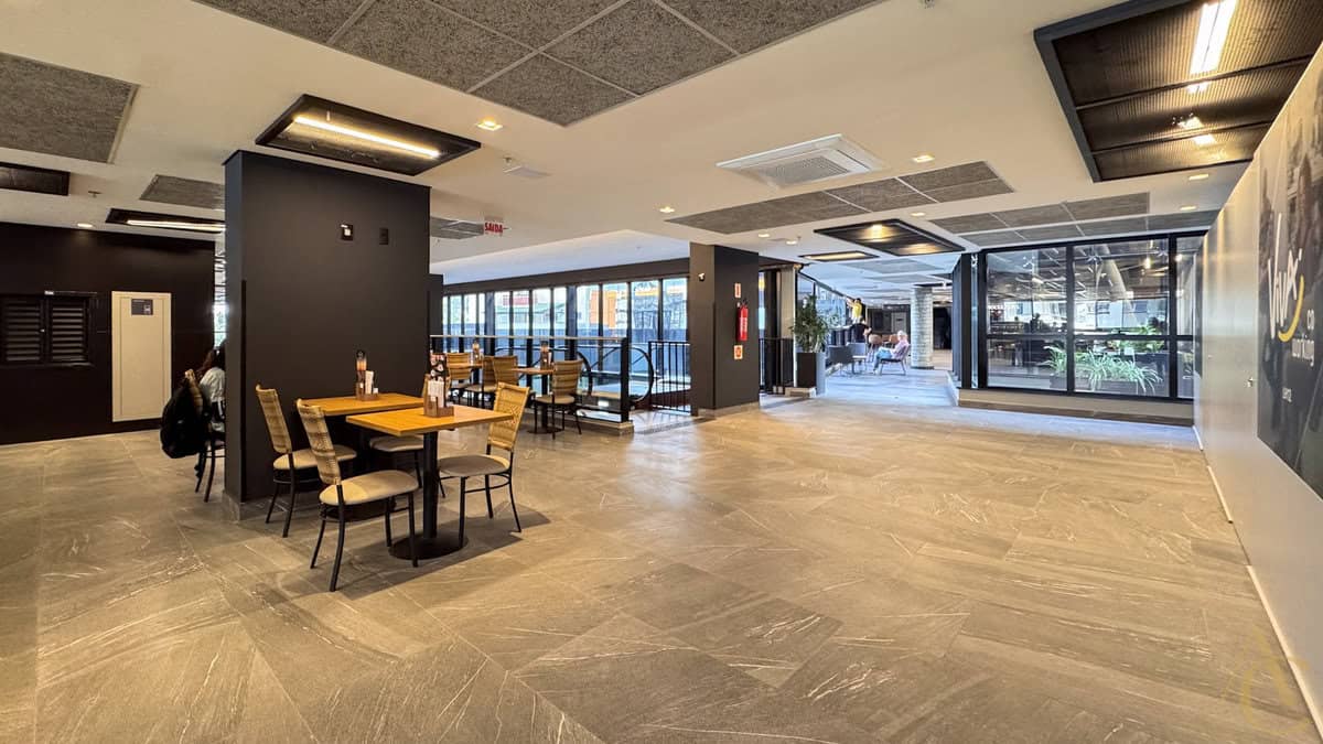 Integração com o Supermercado Angeloni, praça de alimentação com opções gastronômicas e serviços essenciais