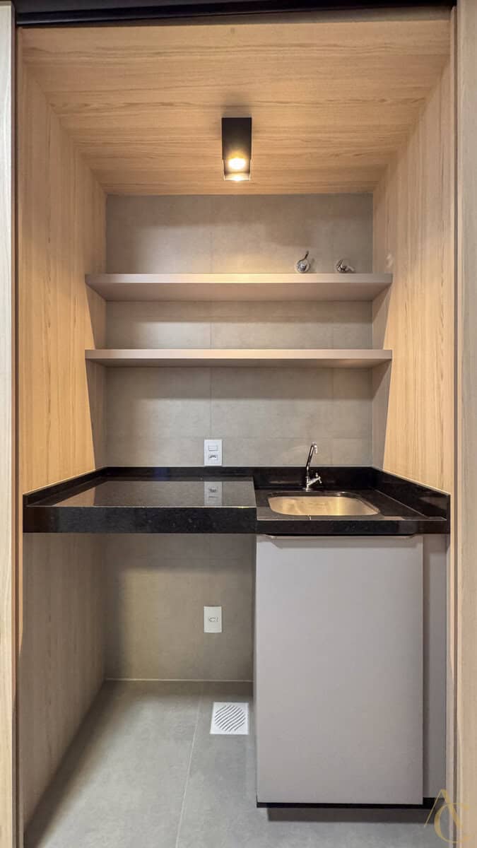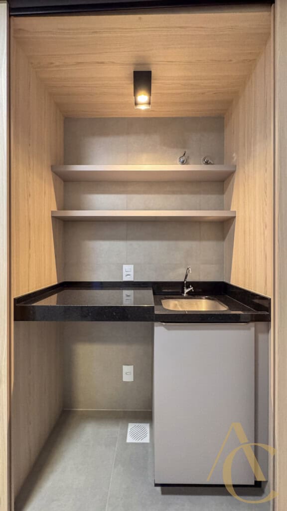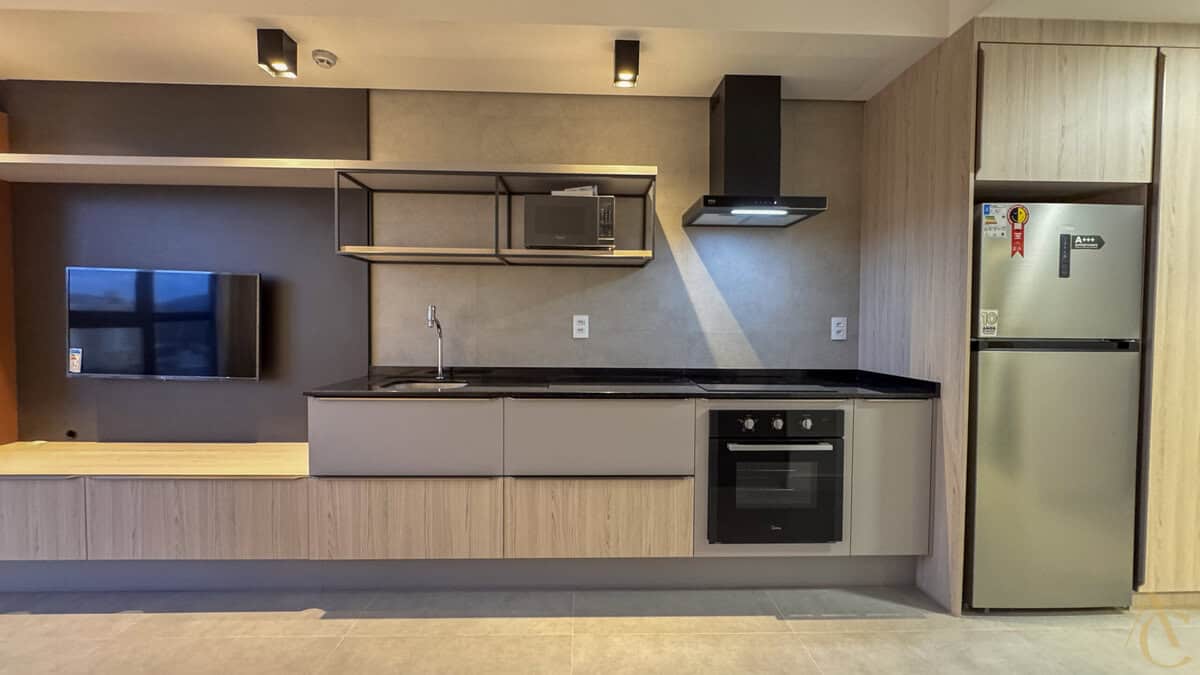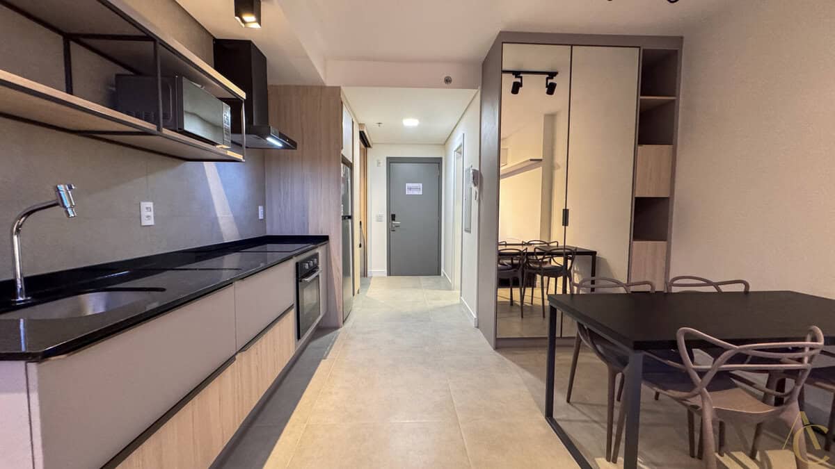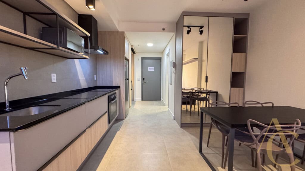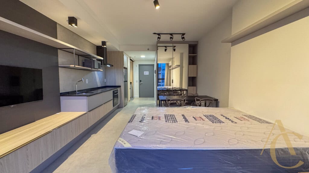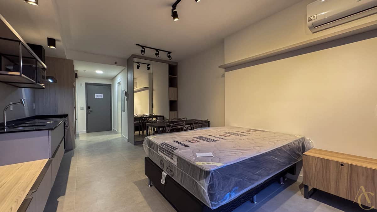 O studio foi planejado para oferecer praticidade sem abrir mão do conforto. Totalmente mobiliado, ele dispõe de cama, guarda-roupa, mesa com cadeiras, geladeira, micro-ondas, fogão e armários bem distribuídos, otimizando cada espaço. Esse cuidado na mobília garante funcionalidade e aproveitamento inteligente da área interna, criando um ambiente ideal para quem valoriza praticidade e bem-estar.